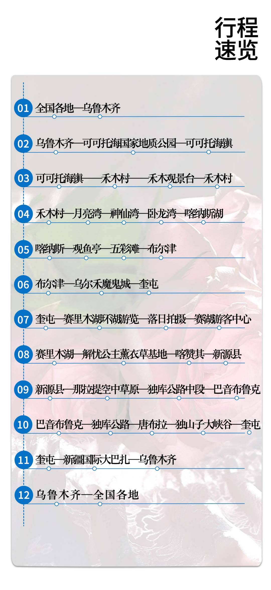 2、住宿:全程包含11晚住宿,市区安排三星或携程3钻酒店,喀纳斯、禾木景区内安排民宿标间,赛里木湖安排商务酒店标间(默认双人间拼住,不提供3人间,如不拼需补房差);如遇酒店满房或特殊原因,不能安排备选酒店时,旅行社有权安排同级别、同标准的其他酒店