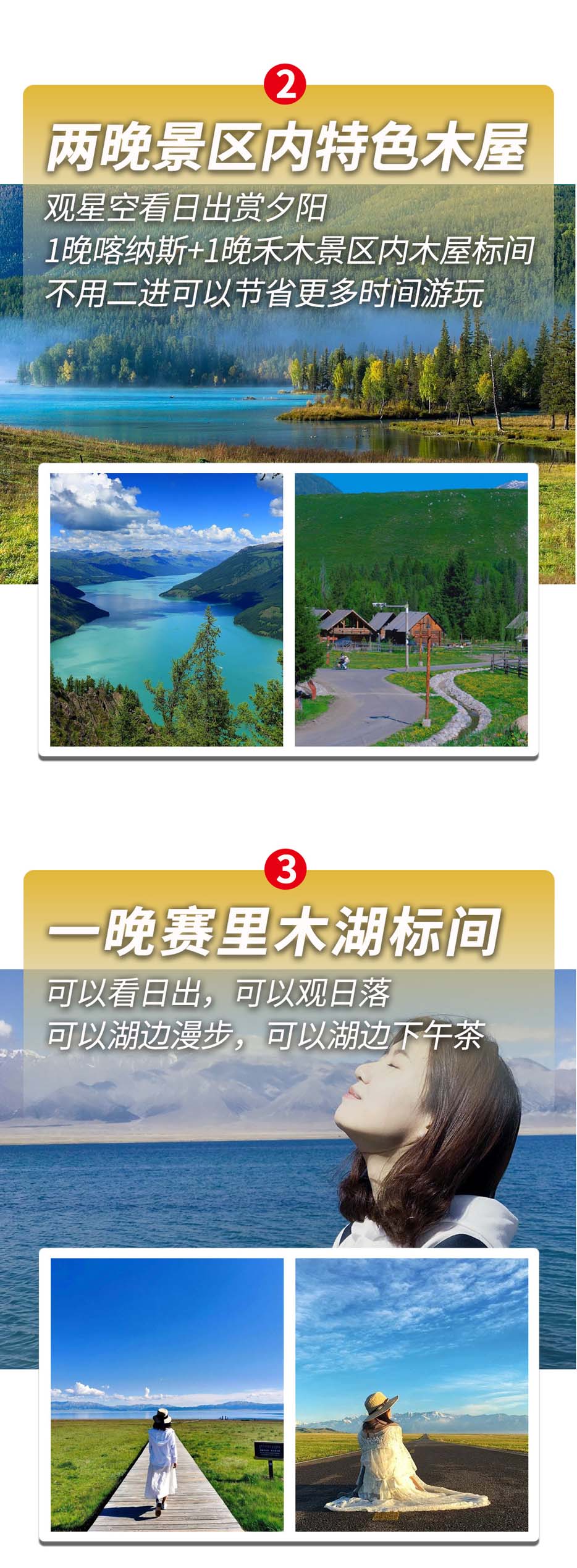 特别安排:喀纳斯湖+禾木村2晚景区内住宿+1晚赛里木湖游客中心标间住宿